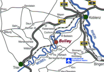 aus Richtung Mainz/Frankfurt: über die A61, Abfahrt Rheinböllen, über den Hunsrück nach Kirchberg - Zell - Bullay aus Richtung Köln/Koblenz: über die Autobahn A48, Abfahrt Kaisersesch, Richtung Cochem - Zell - Alf - Bullay aus Richtung Trier: über die A48, Abfahrt Wittlich, Richtung Zell - Cochem - Bullay (ausgeschildert) |